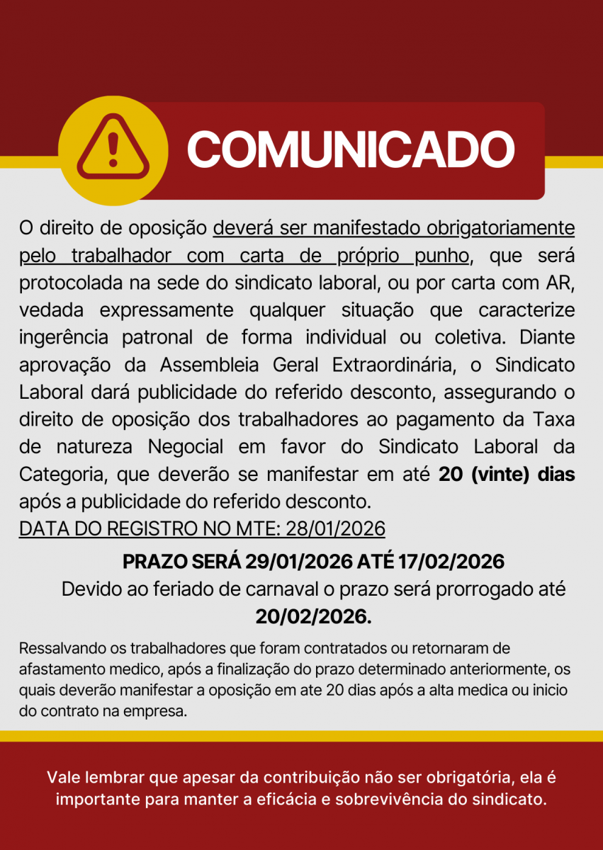 O Sindlimp São José divulga os prazos para a entrega da carta de oposição à TAXA DE SOLIDARIEDADE SINDICAL LABORAL, como consta em Convenção Coletiva.
